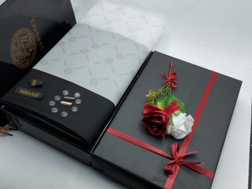 _ياتي القماش مع كامل ملحقات الماركه من ازرار بشعار الماركه وليبارات بشعار الماركه ولوقو حديد بشعار الماركه وعلبه وكيس فخم بسم الماركه.