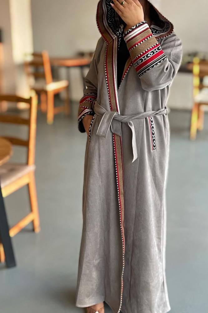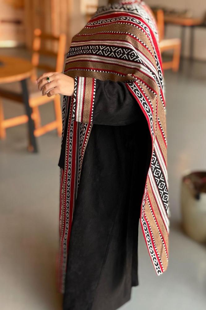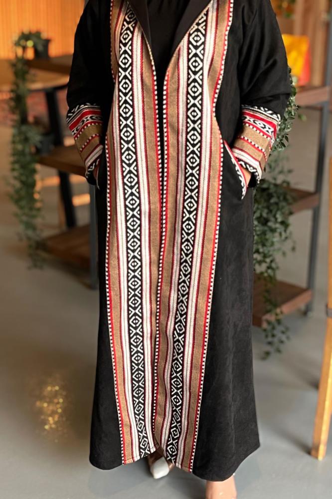 تألقي بإطلالة شتوية دافئة وأنيقة مع عباية الشموه المزينة بتفاصيل السدو التقليدية. تصميم عصري يلبي ذوقك الراقي واحتياجاتك للدفء في فصل الشتاء.